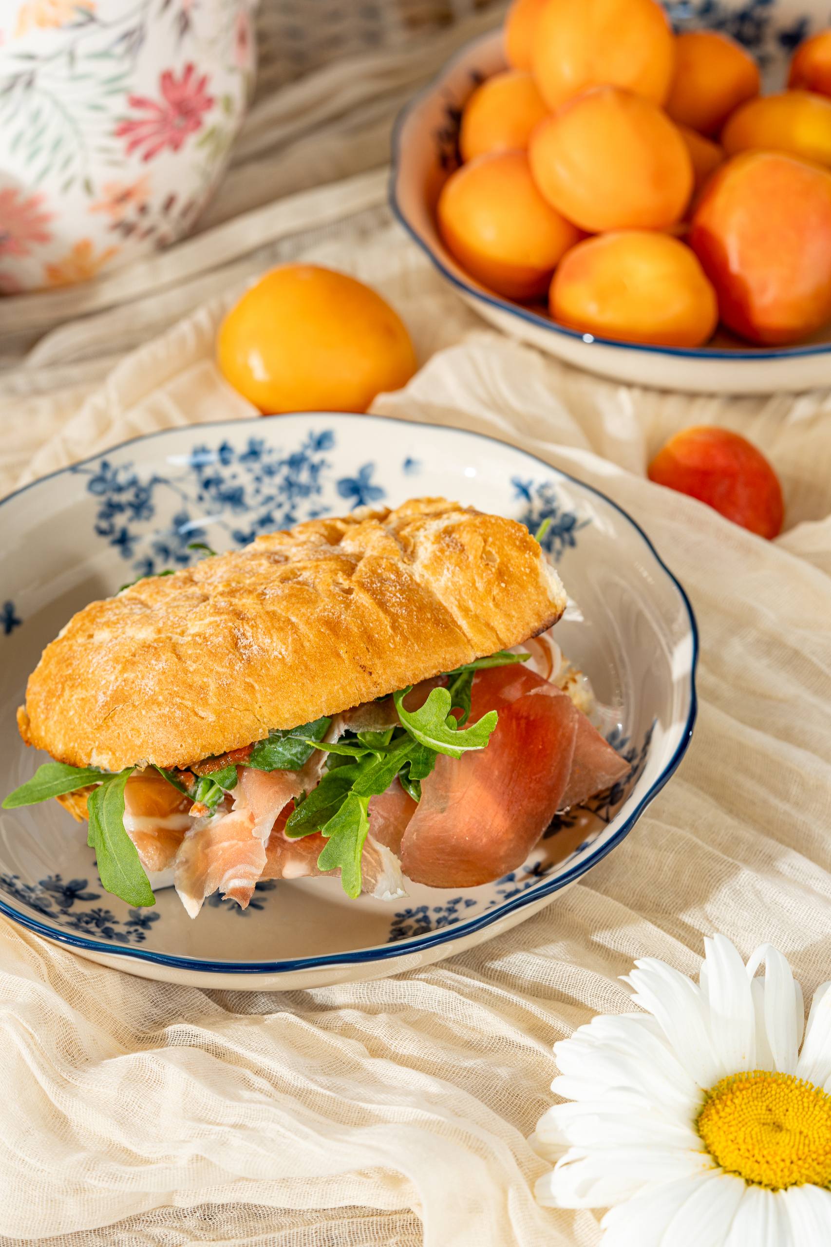 Быстрый и сытный итальянский перекус: сэндвич из чиабатты со шпеком, рукколой и томатным соусом и чиабатта с мортаделлой, сыром Hochland Professional, рукколой, томатами черри и соусом «Качо э пепе» и «Сальса верде».