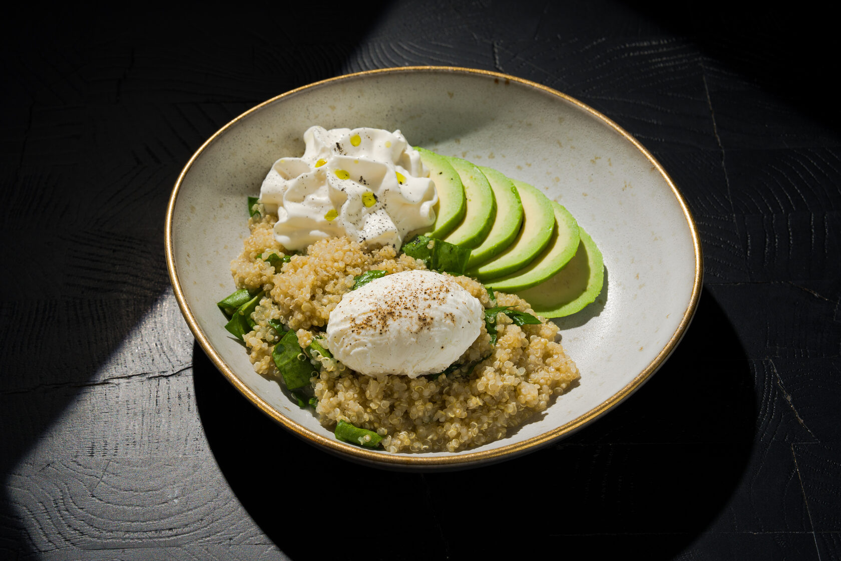 На ваш выбор сразу две интересные каши: овсяная с Nutella, клубникой и маршмеллоу и киноа с кокосовыми сливками, сливочным кремом Hochland Professional и томлёными ягодами.