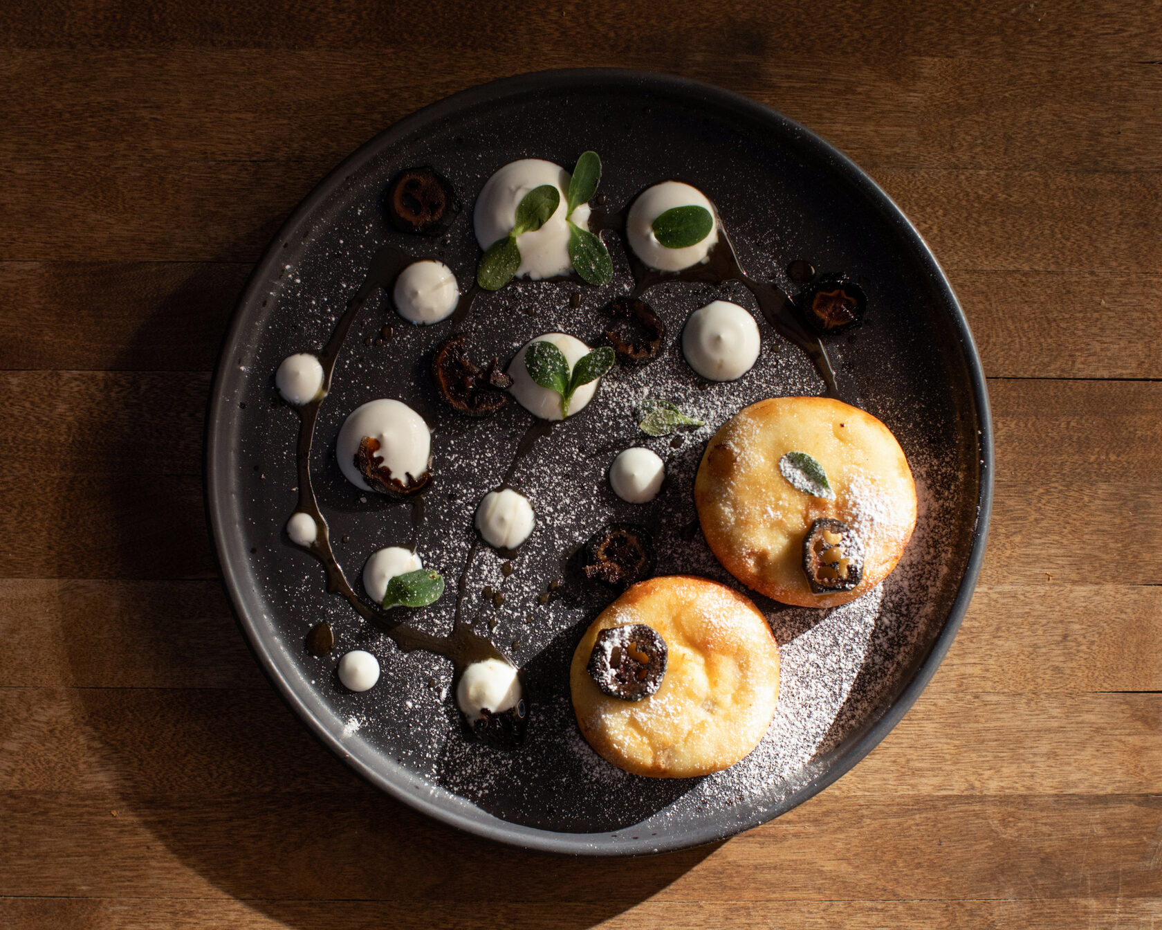 Сочетание, построенное на контрастах: сырники с копчёным сыром сулугуни и вареньем из белой черешни.