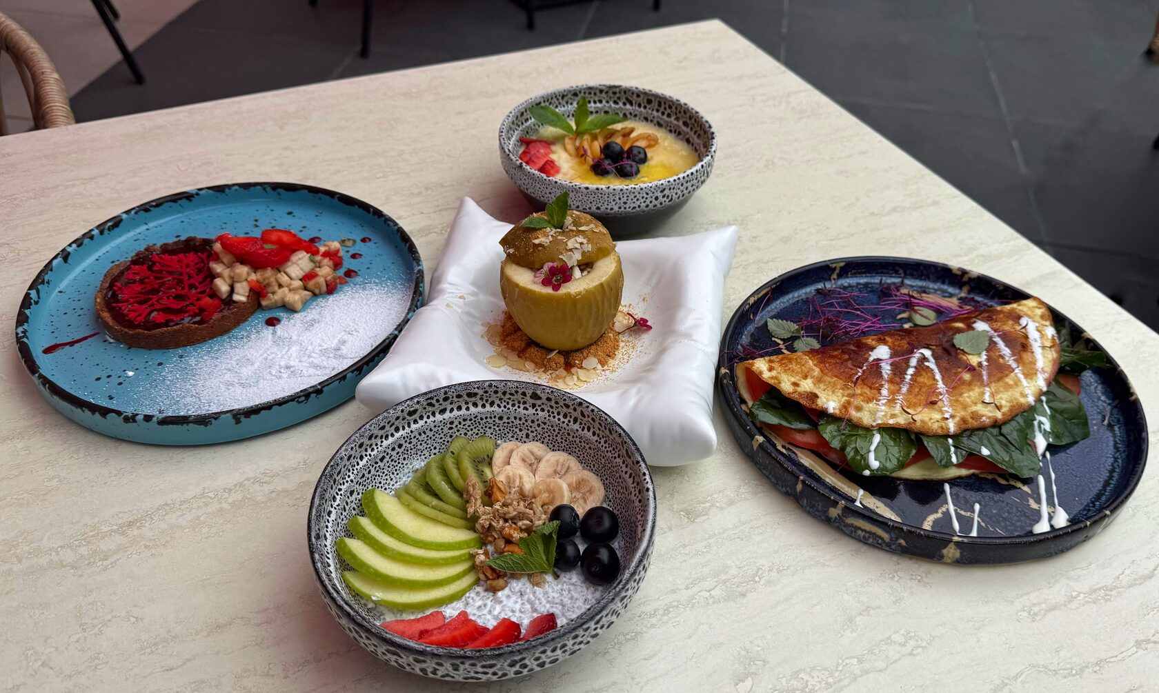 завтрак здесь предлагают: пшённую кашу Мистраль с мушмулой и сулугуни, запечённое яблоко с орехами и медом, фруктовый боул с семенами чиа и тарт из овсяных хлопьев Мистраль с бананом и Nutella.