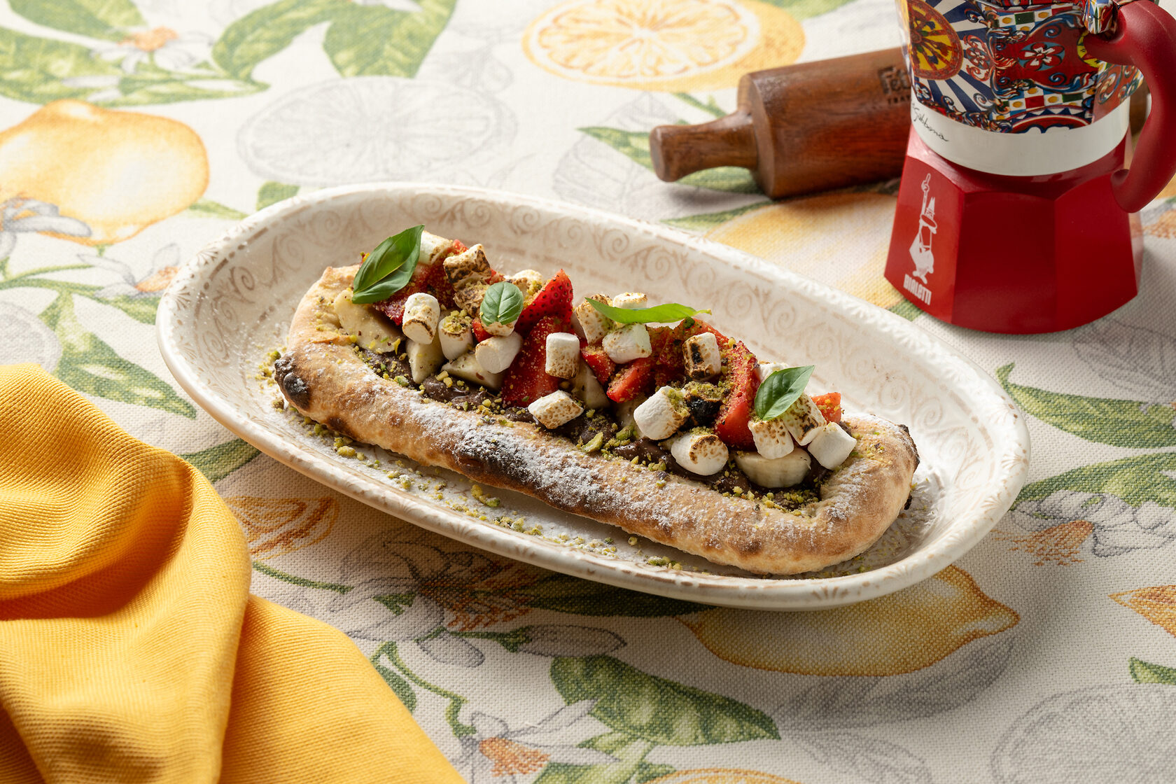 Всё лучшее сразу: фокачча с Nutella, бананом, клубникой, маршмеллоу и фисташками.
